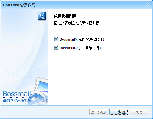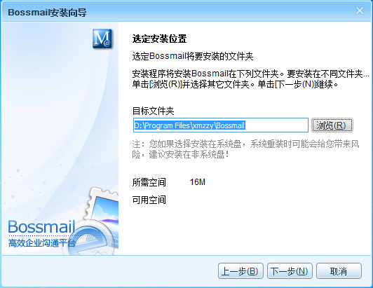 在此界面点击“下一步”在默认目录安装Bossmail或点击“浏览”选择您的Bossmail安装目录。
