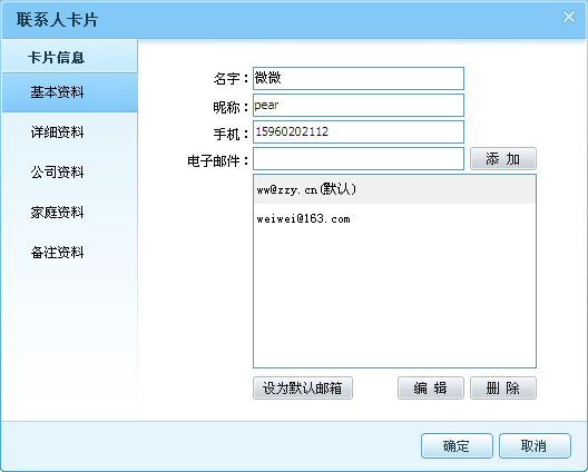 在联系人卡片中填写联系人相关信息,包括姓名、邮箱等。点击“确定”添加成功。