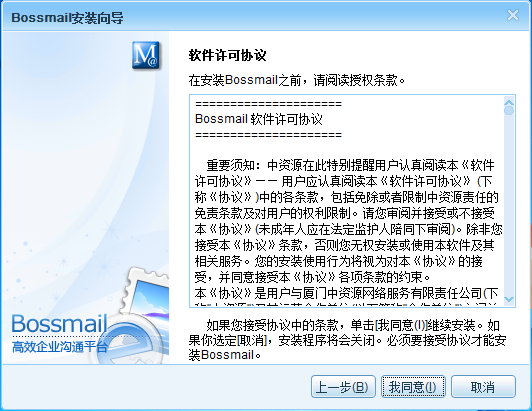 双击下载的安装包,在出现的“安装向导”中点击“下一步”进入《Bossmail软件许可协议》。