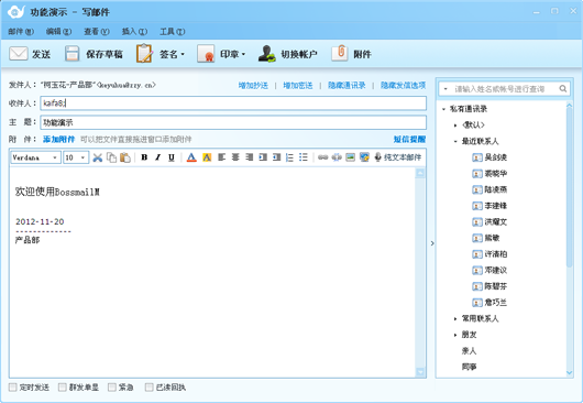 登录BossmailM首页,点击“通讯录”进入通讯录界面。