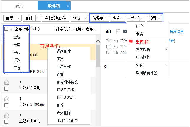 注:对选中的邮件,您可以进行删除、永久删除、作为附件转发、转移到、查看、标记、设置等处理操作。