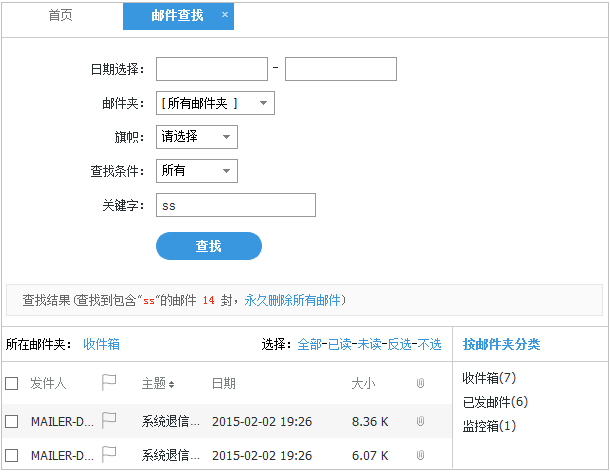 企业邮箱推出无限空间,让您的邮箱容量再也用不完——而伴随着大容量的邮箱,邮件将会越来越多,管理使用起来就不轻松了。为此,经过研发,实现了邮件全文搜索,以方便您查询海量邮件。