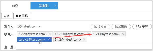 写邮件的时候,您是否需要将重要收件人放在前面呢,您可以试试鼠标选住该重要收件人,进行拖拽即可调整收件人的位置: