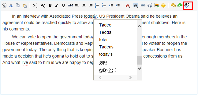 写邮件时,在文字格式工具条中点击“拼写检查”功能,系统将检查内容中的英文单词。
