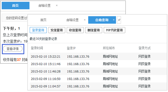 登录邮箱后,在邮箱首页显示您上次登录时间;点击“查看详情”,可以查看该帐号最近五次登录情况,包括时间、登录IP及所在城市: