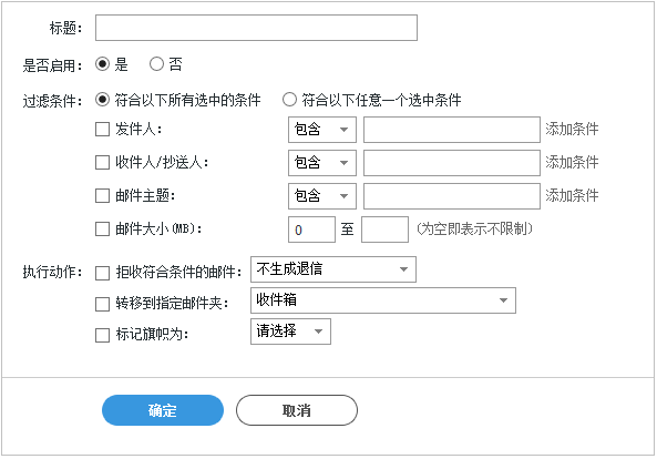 点击增加进入增加邮件过滤规则页面:可选择的“条件”包括收件人、发件人、抄送人、邮件主题。“动作”包括“拒收”、“转移到”、标记标签,其中可转移到的邮箱为邮件夹里存在的邮箱,包括收件箱、草稿箱、已发邮件、垃圾箱、不明邮件箱和用户自定义的邮箱: