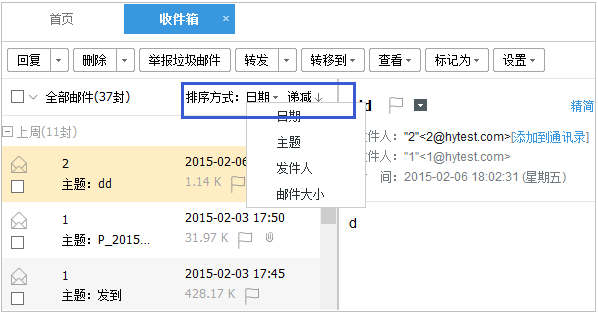 在您进入邮箱查看邮件列表时,在排序方式处可以选择排序的。默认情况下的排序方式是按日期降序排列。在排序方式下拉框可以选择按日期/发件人/主题,升序/降序排列:
