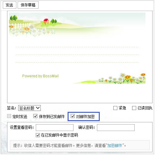写信页面,勾选页面下方“邮件加密”,设置查看密码;设置密码时需要您输入两次以确保密码无误: